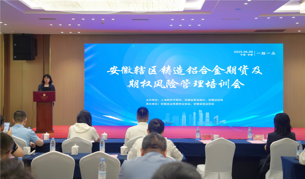 为贯彻落实党的二十届三中全会和习总书记考察安徽重要讲话精神,做好绿色金融大文章,助力安徽地区涉铝产业链高质量发展,6月6日,安徽证监局打造的“徽韵期识”专题品牌“一期一品”首场培训——铸造铝合金期货期权风险管理培训座谈会在安徽合肥成功举办。本次活动由上海期货交易所、安徽省委金融办、安徽证监局主办,安徽省证券期货业协会、安徽省铝业协会承办,是上期所铸造铝合金期货期权上市培训中,重点以地方涉铝产业客户为主体的专题培训座谈活动。安徽省涉铝企业代表、省工商联、省工信厅等地方政府部门人员以及金融机构从业人员近200人参加培训。