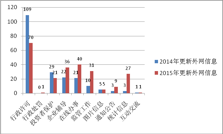 2015年全年,我局累计发布和更新外网信息241条,同比增长18.71%,涵盖局外网所有板块,包括行政许可70条,行政处罚1条,投资者保护21条,辅导企业信息36条,在线办事40条,监管工作31条,图片信息5条,通知公告9条,统计信息27条,互动交流1条。