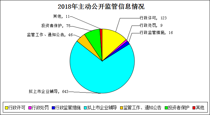 2018年全年,我局共主动公开监管信息923条,其中:涉及辖区市场主体的行政许可信息123条,行政处罚信息9条,行政监管措施信息16条;拟上市企业辅导信息643条;监管工作、通知公告信息46条;投资者保护信息75条,包括机构名录、普法信息、风险警示等;其他信息11条,包括办事指南、证监局介绍、统计信息、年度报告等。