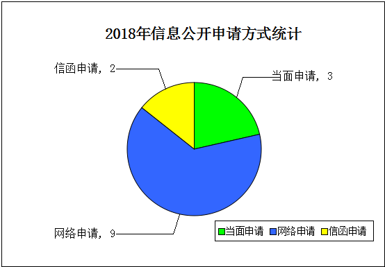 2018年,我局共收到14件信息公开申请,其中:当面申请3件,占比22%;网络申请9件,占比64%;信函申请2件,占比14%。