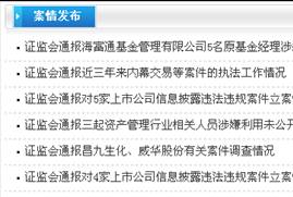 在“政策法规”栏目公开或更新相关证券期货法律法规31件。在“稽查执法”栏目发布证券期货市场违法违规案件查处情况12期,发布证监会与公安机关加强执法合作工作的最新进展情况、对市场操纵、利用未公开信息交易等6项稽查执法工作动态。在“行政处罚委”栏目发布行政处罚决定书92件、市场禁入决定书15件。在“行政复议”栏目发布行政复议决定67件。