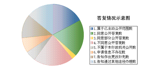 会机关及各派出机构对收到的128件政府信息公开申请均已在法定期限内作出答复。其中,属于已主动公开范围的22件,占17.19%;同意公开答复的25件,占19.53%;同意部分公开答复3件,占2.34%;不同意公开答复的27件,占21.09%;不属于本行政机关公开的7件,占5.47%;申请信息不存在的10件,占7.81%;告知作出更改补充的16件,占12.5%;告知通过其他途径办理18件,占14.06%。