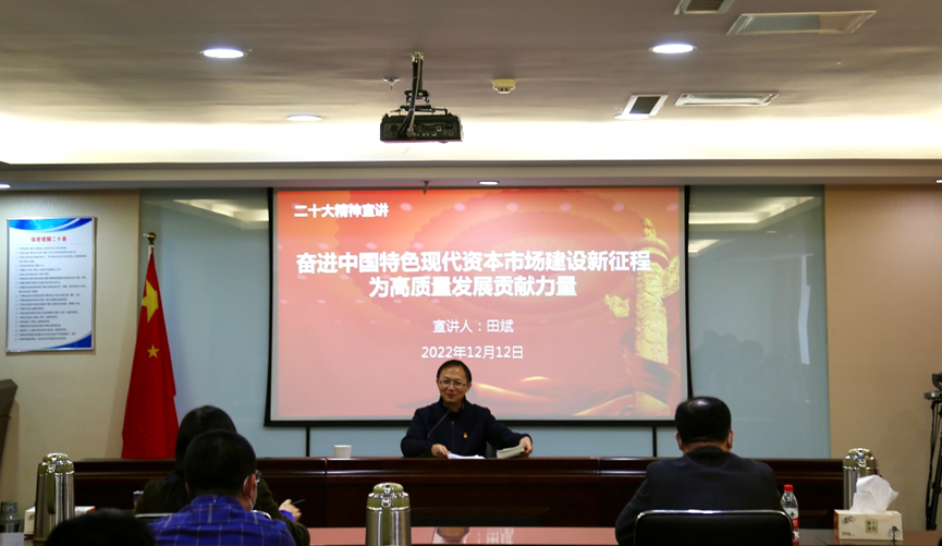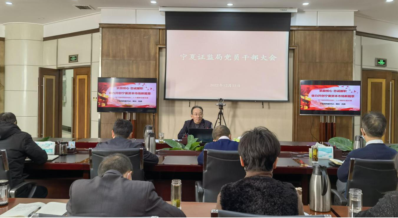 宁夏局党委深入辖区市场主体、基层党支部宣讲党的二十大精神,以专题党课形式传递党的二十大报告精髓,持续兴起学习宣传贯彻热潮。党委同志学习分析阐述党的二十大报告的主要内容,总结分析辖区近十年工作成效和堵点难点,明确外抓市场发展、内抓管党治党的工作目标,提出“三坚持三提升”的工作要求。一是坚持党委统筹,提升政治站位。全面贯彻“五个牢牢把握”,用好考核“指挥棒”,切实把思想和行动统一到党的二十大精神上来。二是坚持深学细悟,提升理论自觉。开展“大学习、大讨论、大宣传、大实践”,推动学习见质见效、讨论走深走实、宣传有声有色、实践落实落细。三是坚持学用结合,提升学习效果。坚决落实党中央重大决策部署和会党委各项工作要求,坚定不移走中国特色现代资本市场发展之路,努力开创宁夏资本市场新局面。