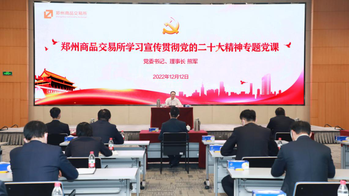 郑商所党委书记、理事长熊军为全所党员职工讲授学习党的二十大精神专题党课。熊军指出学习宣传贯彻党的二十大精神,是当前和今后一个时期的首要政治任务,要抓好“大学习、大宣讲、大培训、大讨论、大落实”,在全面学习、全面把握、全面落实上下功夫。熊军强调全所上下要准确把握党的二十大提出的中心任务、作出的战略部署、提出的实践要求,深刻领悟“两个确立”的决定性意义,运用好“两个结合”“六个必须坚持”,从理论、历史、实践维度把握中国特色现代期货市场的内涵和主要特征,找准期货市场服务中国式现代化的着力点、突破口,走好中国特色现代期货市场发展之路,推动党的二十大精神在郑商所落地生根、开花结果。