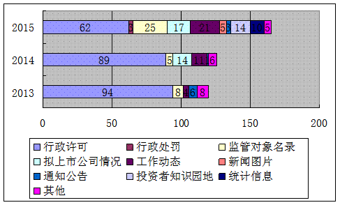 2015年,共完成165件公开信息的整理、审查和公开发布、更新工作,所有信息均通过中国证监会互联网站对外公开。其中,行政许可类62件(审核结果12件、审核进度公示47件、审核项目更新3次)、行政处罚结果3件、监管对象名录更新25次、拟上市公司有关情况17件、工作动态21件、更新新闻图片5件、通知公告3件、投资者知识园地14件、统计信息10件、其他5件。