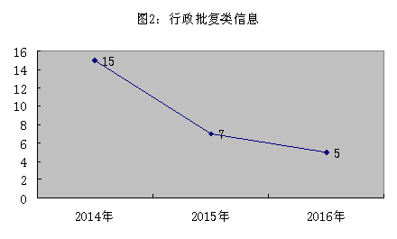 1.公开信息突出监管工作重点。一是资本市场全面贯彻简政放权,行政批复类逐年减少。行政批复类信息2014年15条、2015年7条、到2016年减少到5条(见图2)。二是体现资本市场依法监管、全面监管、从严监管。2016年主动公开行政监管措施4条,2014年和2015年这类信息均为0。三是切实增强监管服务水平。我局公布的办事指南类信息逐年增多,2014年4条、2015年6条,到2016年则为9条。四是注重投资者保护工作。2015年和2016年投资者保护类信息基本保持在15条左右。