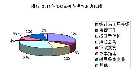 2016年,我局通过政府网站累计公开各类信息119条,与去年118条基本持平。包括统计信息与辖区情况介绍类信息33条、监管工作类信息9条、投资者保护类信息14条、通知公告类信息32条、行政批复类信息5条、办事指南9条、辅导备案企业类信息14条和其他类信息3条。各类公开信息占比,详见图1: