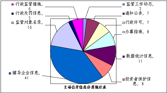 我局在中国证监会政府信息公开平台公开政府信息108条,具体包括:监管工作动态2条、通知公告7条、行政许可7条、办事指南8条、数据统计信息11条、投资者保护信息8条、辅导企业信息41条、监管对象名录16条、行政处罚信息2条,行政监管措施6条。