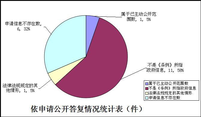 我局对收到的19件信息公开申请全部进行了答复,其中,重复申请合并办理2件,起草答复文书17份。在法定期限内作出答复的17件,2件延期答复。对19件申请公开事项中,属于已主动公开范围的1件,占5%;不同意公开12件,其中,不是《条例》所指政府信息的11件,占58%, 法律法规规定的其他情形1件(因所涉及第三方不同意公开),占5%;申请信息不存在的6件,占32%。