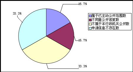 我局对收到的6件信息公开申请全部进行了答复,其中,2件在法定期限内作出答复,4件延期答复。延期答复主要原因为申请人一次申请事项较多,涉及内容复杂。对6件申请公开事项中,属于已主动公开范围的1件,占16.7%;不同意公开1件,占16.7%;不属于本机关公开范围内的2件,占 33.3%;申请信息不存在的2件,占33.3%。