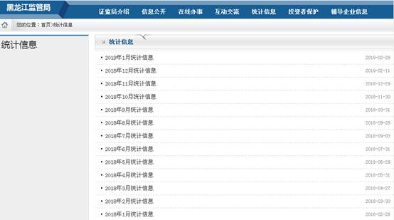 在“统计信息”栏目按月发布辖区证券期货市场概况12期。在“投资者保护-监管对象”栏目定期更新辖区上市公司、新三板挂牌公司、证券期货经营机构、私募机构等名录,方便社会公众查询使用。