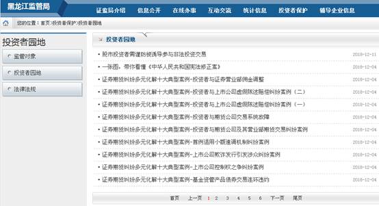 在“投资者保护-投资者园地”发布证券期货纠纷多元化解典型案例、防范非法集资、警惕互联网“非法荐股”风险、私募投资者教育知识问答等信息共计25条;在“投资者保护-法律法规”栏目发布《证券期货投资者适当性管理办法》《上市公司股权激励管理办法》《证券投资者保护基金管理办法》等法律法规共计22条。