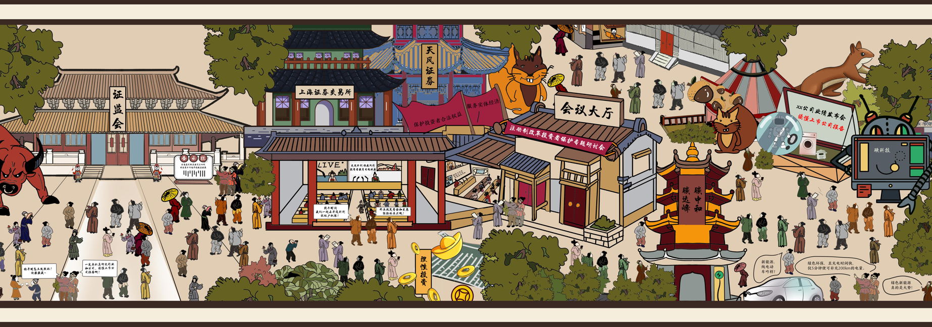 以“清明上河图”为创意,推出主题投教作品《新时代投资万象图》(局部)