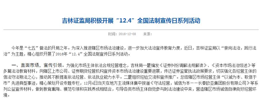 一是开展“吉林证监局积极开展“12.4”全国法制宣传日”系列活动,在辖区开展投资者保护和宣传教育活动,取得了较好的成效。