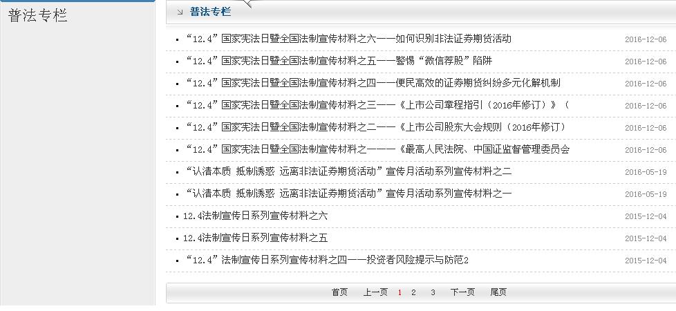 在“普法专栏”栏目发布信息8件。主要包括“全国法制宣传日”法制宣传系列材料以及非法证券期货典型案例宣传材料等。