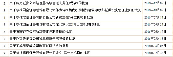 贯彻落实国务院有关工作要求,对证券公司经理层人员任职、董监高任职资格、设立分支机构、代销基金等的行政许可事项受理及审核进度以及批复情况定期予以更新公布。2016年共公布行政许可批复10件,行政许可受理及审核事项12件。