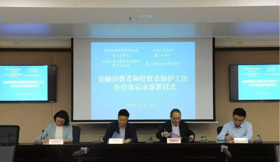 为深入贯彻中央金融工作会议精神,落实国家金融监管总局和中国人民银行、中国证监会关于金融消费者权益保护和投资者保护工作合作备忘录等文件要求,健全辖区证券期货投资者综合保护体系,11月21日,厦门证监局与厦门金融监管局、人民银行厦门市分行、厦门市地方金融管理局(以下统称四部门)共同签署《关于金融消费者权益保护和投资者保护工作的合作备忘录》,并会同厦门市委网信办、市中级人民法院、市市场监管局、市信访局等单位召开第一次联席会议,建立了厦门辖区跨部门的金融消费者和投资者权益保护工作协调机制。