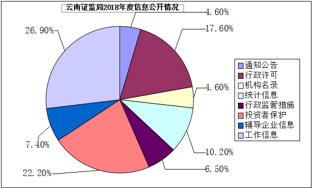 2018年,云南证监局通过中国证监会互联网网站主动公开政府信息108条。其中通知公告类信息5条,约占4.6 %;行政许可类信息19条,约占17.6 %;机构名录5条,约占4.6%;辖区统计信息11条,约占10.2%;行政监管措施7条,约占6.5%;辅导企业信息8条,约占7.4%;投资者保护类信息24条,约占22.2%;监管工作信息29条,约占26.9%。属于主动公开范围的政府信息,我局均在规定期限内通过中国证监会互联网网站予以公示。具体情况见下图:
