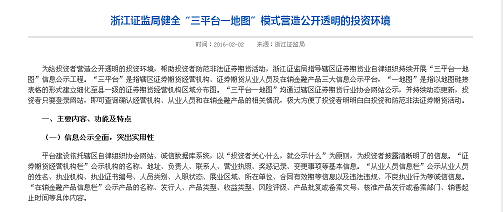 为给投资者营造公开透明的投资环境,帮助投资者防范非法证券期货活动,我局指导辖区证券期货业自律组织持续开展“三平台一地图”信息公示工程。“三平台”是指辖区证券期货经营机构、证券期货从业人员及在销金融产品三大信息公示平台,“一地图”是指以地图链接表格的形式建立细至县一级的证券期货经营机构区域分布图。“三平台一地图”均通过辖区证券期货行业协会网站公示,并持续动态更新,投资者只要登录网站,即可查询确认经营机构、从业人员和在销金融产品的相关情况,极大方便了投资者明明白白投资和防范非法证券期货活动。